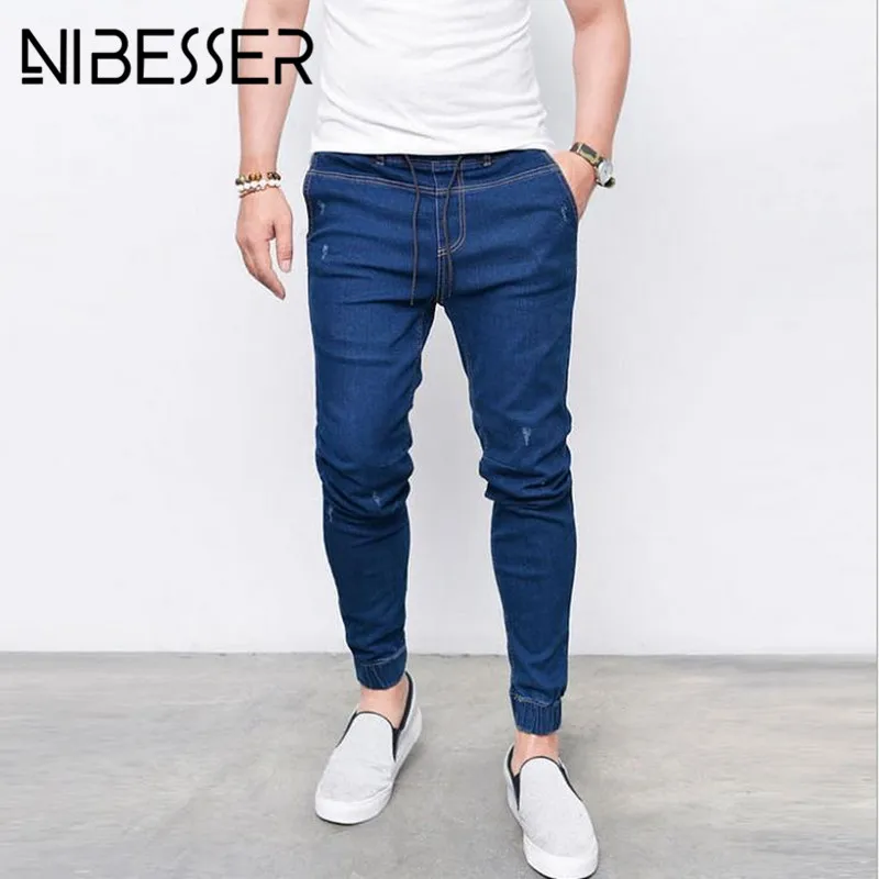 Goede Koop NIBESSER 2018 mannen Harem Jeans Gewassen Voeten Glanzend Denim Zwarte Broek Hip Hop Sportkleding Elastische Taille Joggers Broek Plus size 3XL Goedkoop.