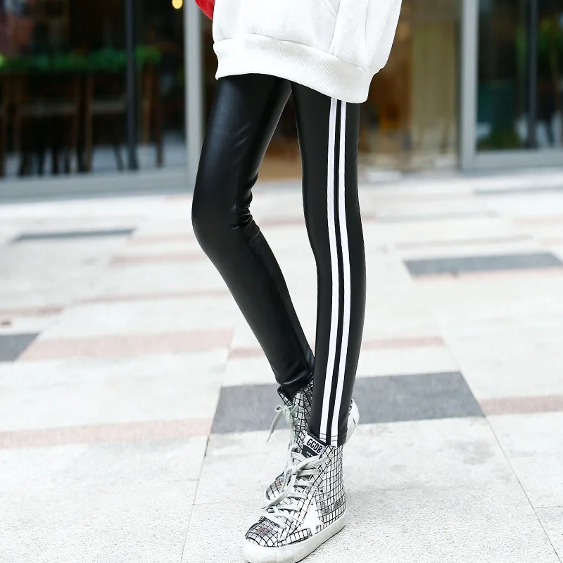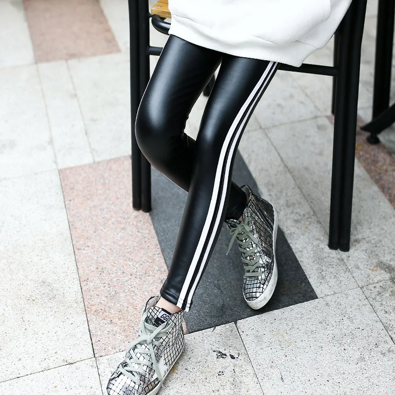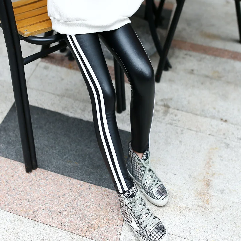 Kopen Goedkoop Kids 2017 Winter PU Fleece Broek Kinderen Meisjes Kunstleer Mid taille Broek Grote Meisjes Gestreepte Leggings School Kleding Prijs.