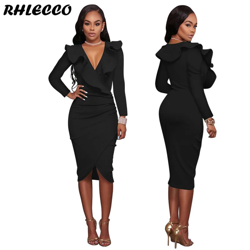 Goede Koop 2018 Vrouwen Herfst Jurk Sexy Lange Mouwen V hals wit Potlood Party Jurken Dames Ruches Bodycon slim Midi Zomer Mouwloze Goedkoop.