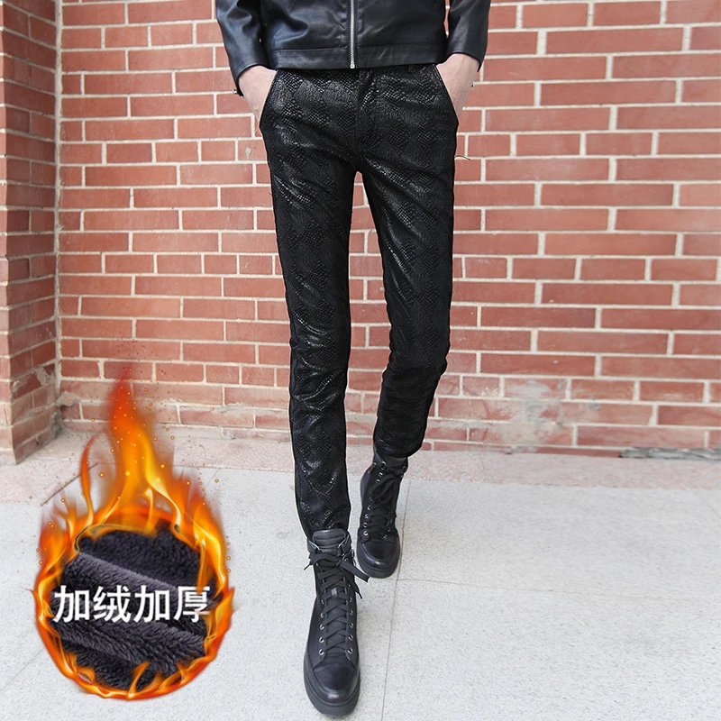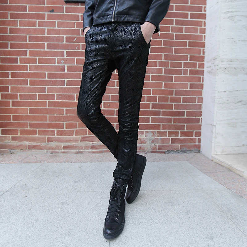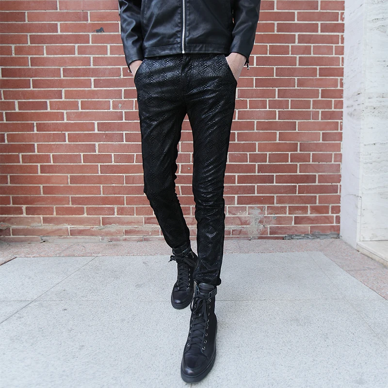 Beste Kopen Herfst en winter nieuwe mode persoonlijkheid snake mannen lederen broek broek mannelijke Koreaanse versie van de Slim broek kappers Goedkoop